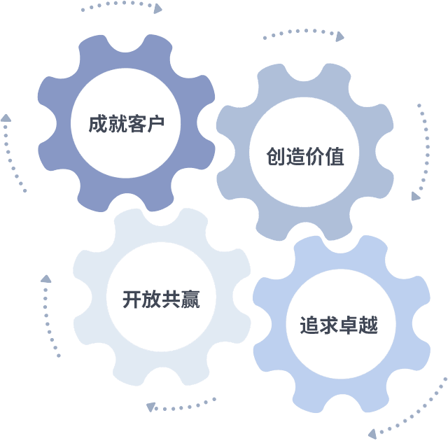 成就客户是一切决策的出发点,,创造价值是衡量所有工作的标准,,,,追求卓越是我们做事做人的态度,,,,开放共赢是我们的格局也是最终的结果。。。价值观的齿轮环环相扣,,,,推动着组织里的每个人不断向前。。